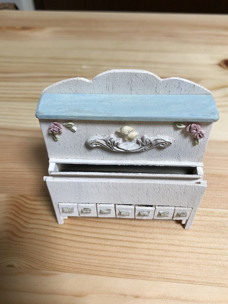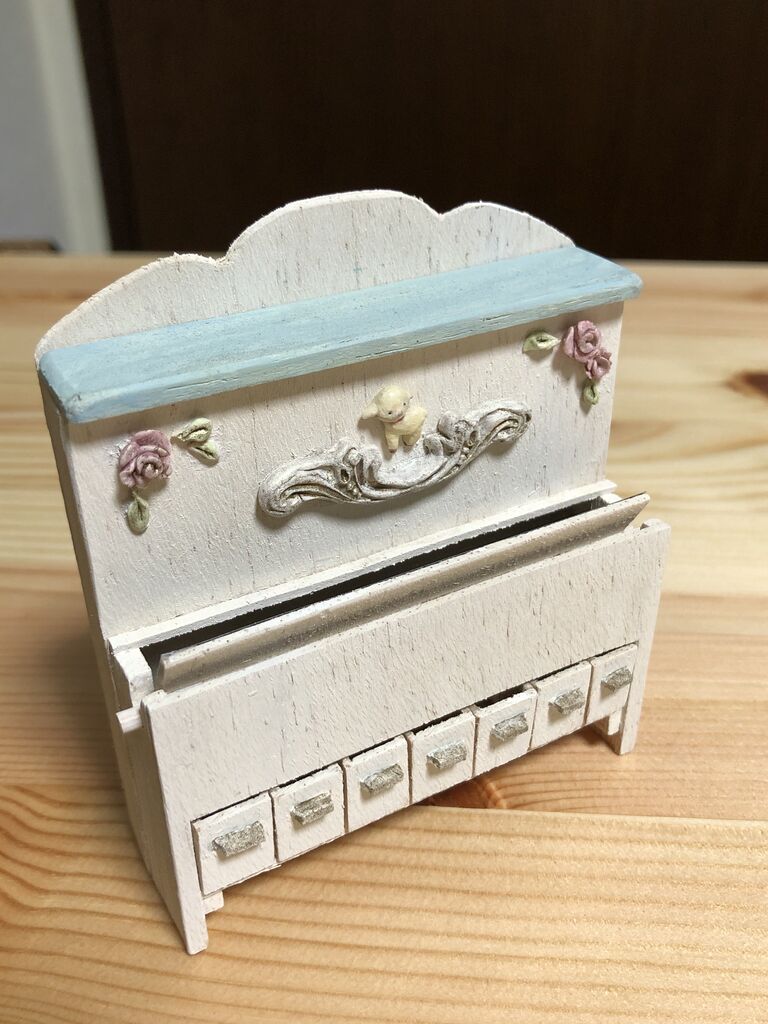 またその頃コロナには全く関係なく生活の中で家具を探していて、ロココ調の家具は素敵だなあと見ていたところ、偶然ネットでロココ調の「ミニチュア」のピアノを見つけました。アップライト(コンソール)ピアノの形で、可愛らしい彫り物がしてあり目を奪われたのです。