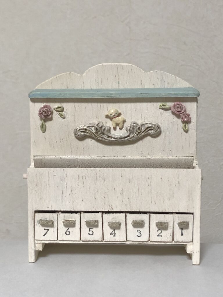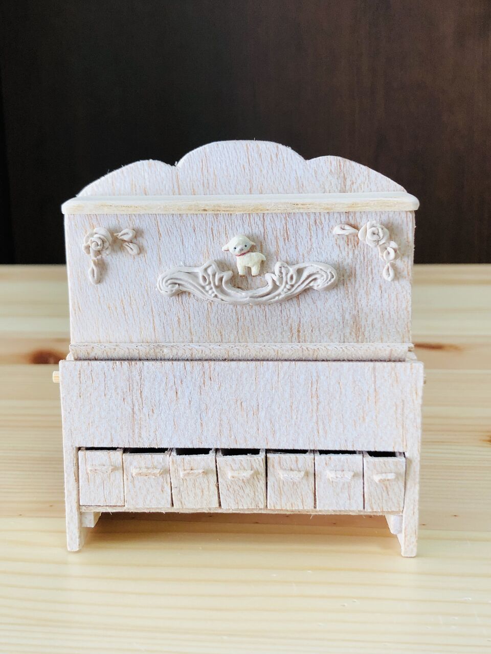 そのピアノは1/6サイズで私のパペット人形は1/12なのでその中では使えないな、でも素敵だな、と眺めていました。そうこうしているうちに、なんとなくあのマスクピアスとして作ったこひつじを前面につけたピアノは可愛いだろうと思い始めました。でも私はピアノは弾けないのでそのうちコマ撮りなんかした時に取り入れたとしても音をつける事ができません。そしてなんだか分からないけれど分包機が頭に浮かびました。アップライトピアノ型の分包機は可愛いかも。…なんでや。